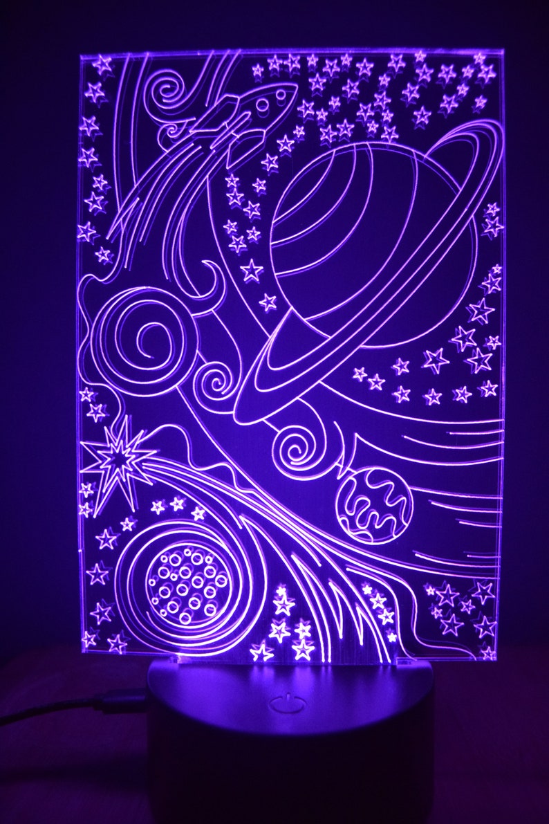 Each lamp features an engraved acrylic plate with a 3D illusion effect and an RGB LED base, allowing you to switch between multiple colors and lighting modes. Choose from a wide range of designs — spiritual symbols, sacred geometry, gaming themes, car models, and artistic visuals — crafted to match modern interiors and personal style.