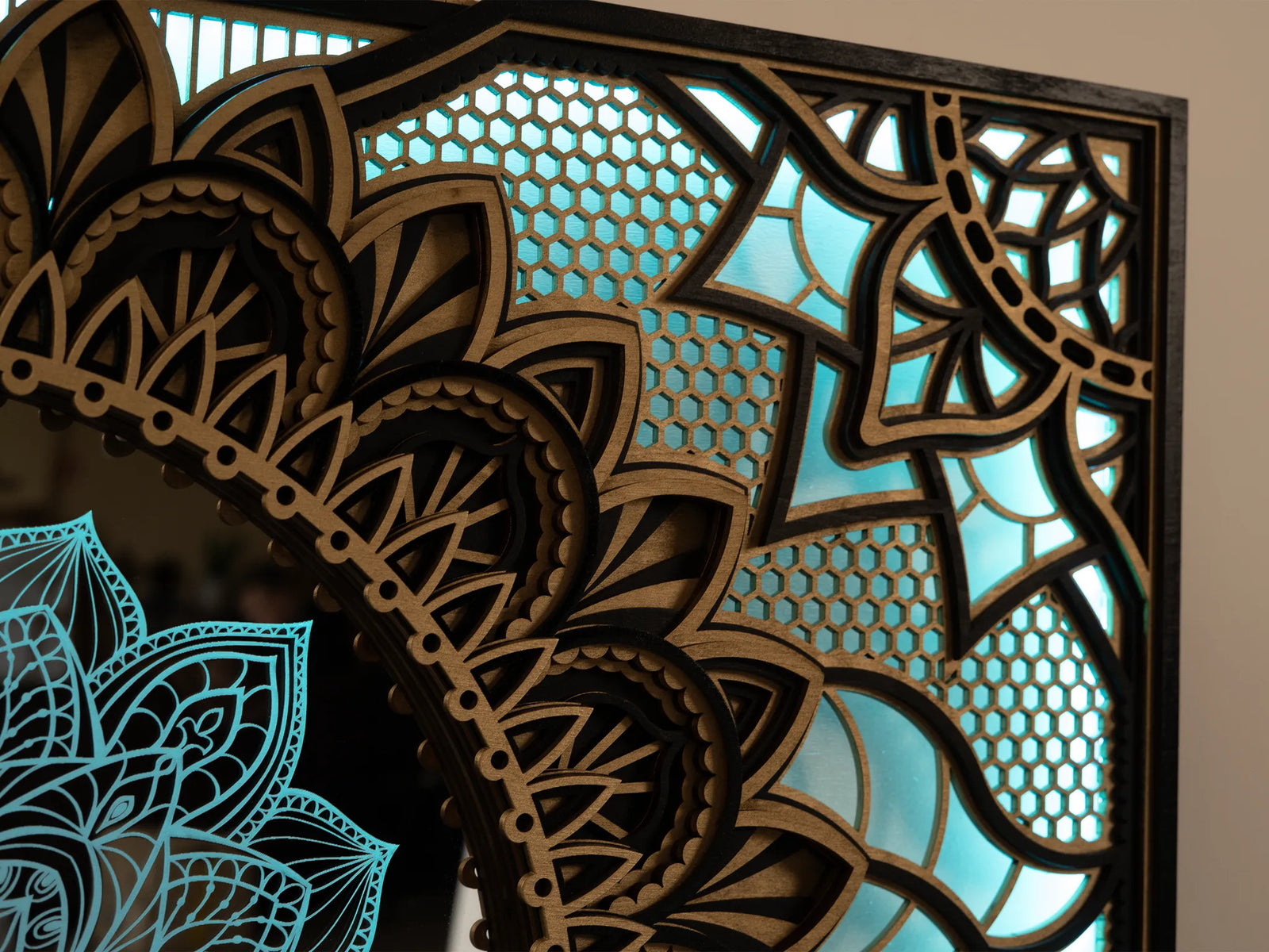 • Wooden mandala wall art with integrated LED lighting